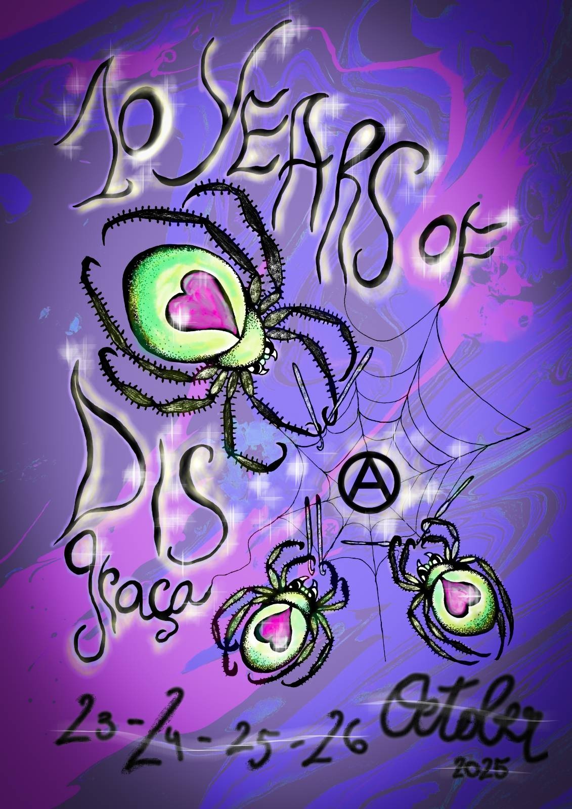 Estamos bastante atrasades (quase 1 mês e meio, para ser mais precise), mas não havia como não celebrar 10 anos de existência disgraçada! Como de costume, vamos ter concertos e conversas, comidinha vegana da boa. E... para além de celebrar uma década de existência, queremos celebrar uma outra coisa: conseguimos ter o dinheiro necessário para comprar coletivamente o nosso espaço!!! No início parecia um sonho inalcançável, mas com a ajuda de todes vocês, quer aqui nas catacumbas, a organizar benefits por todo o mundo fora, a dar-nos um empréstimo solidário, a fazer uma doação no crowdfunding... conseguimos!! Agora só falta assinar a escritura e a Disgraça passa a ser nossa!!