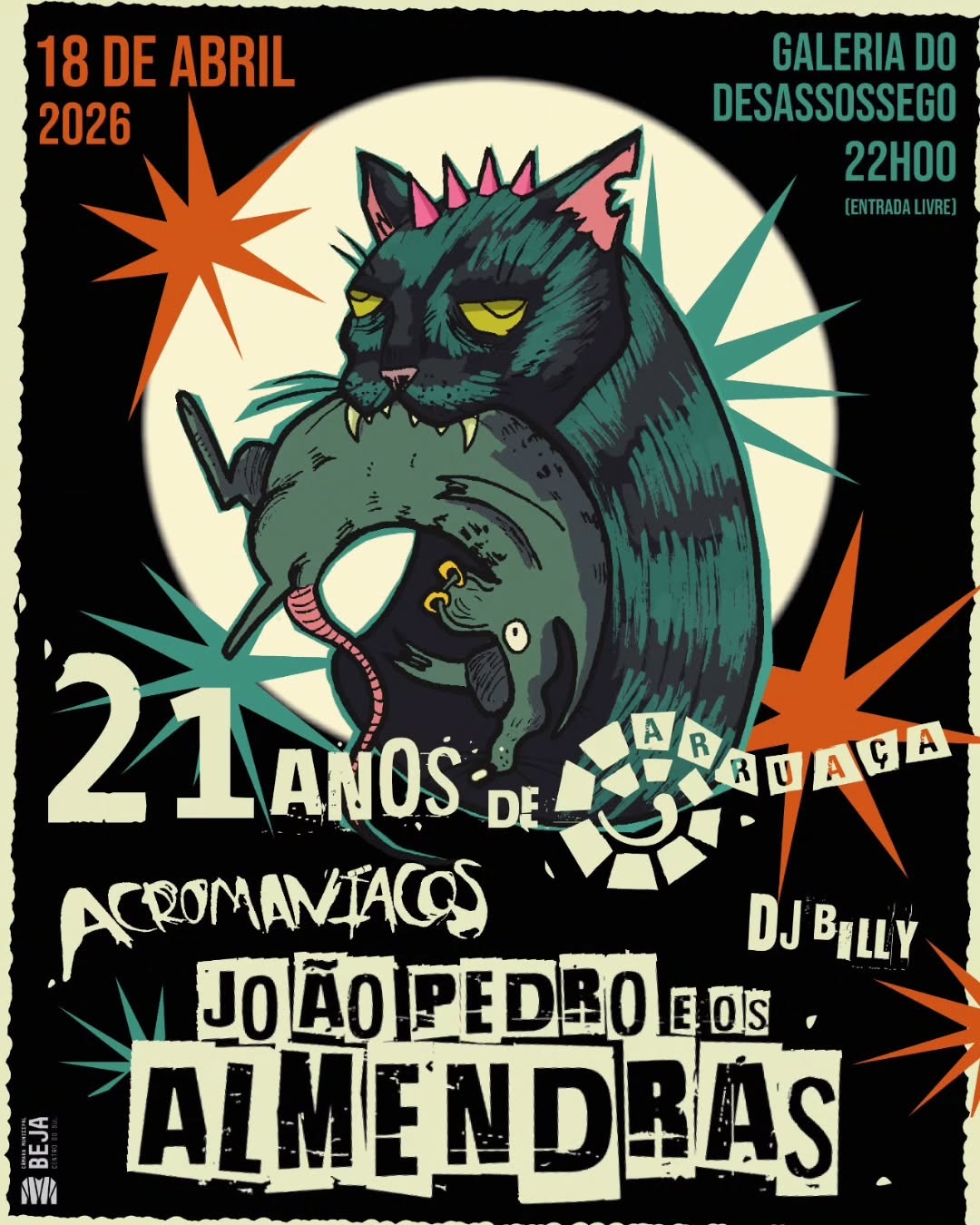 Para encabeçar esta celebração dos 21 anos temos João Pedro e os Almendras. João Pedro Almendra dispensa apresentações. São mais de 40 anos na cena punk nacional e traz consigo um punhado de músicas que fazem parte da nossa memória coletiva: “Chuta Cavalo”, “Veneno”, “Quero Ser Eu”, “É Difícil”, “Carraspana”, “Sr. Políticos” e tantas outras cujos refrões serão entoados de garganta bem aberta.
