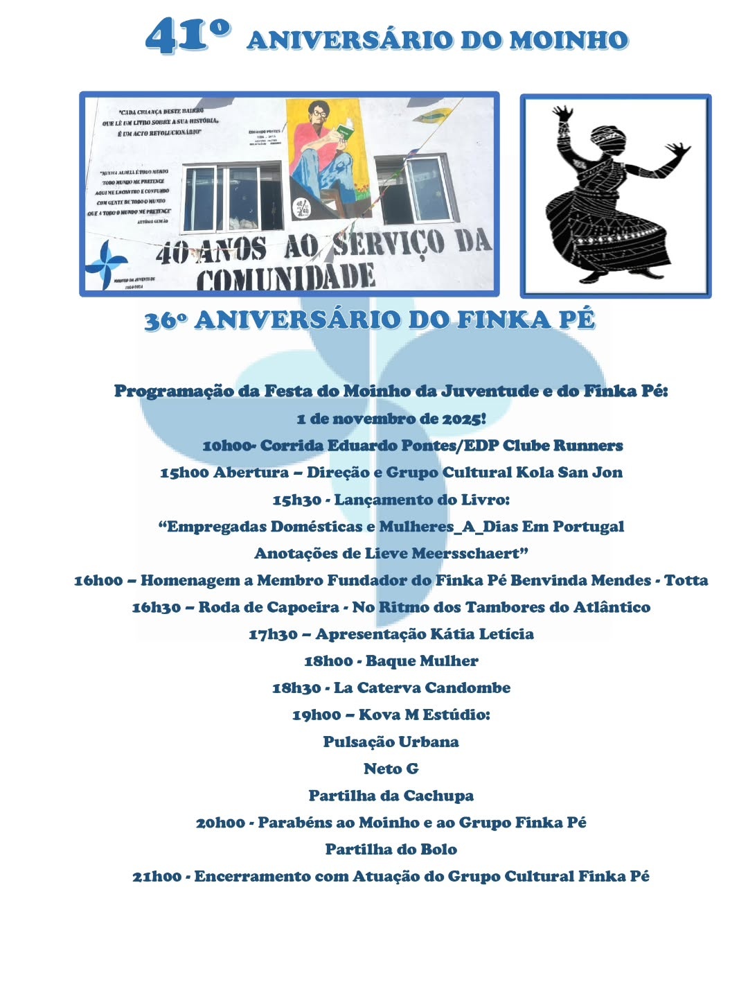 A Direção da Associação Cultural Moinho da Juventude tem a honra de convidar todos os associados, colaboradores e todas as pessoas que, diariamente, contribuem para a construção do futuro da nossa instituição a participarem na festa de comemoração do 41.º aniversário da Associação e do aniversário do grupo cultural Finka Pé, que terá lugar no dia 1 de novembro de 2025, a partir das 15 horas.