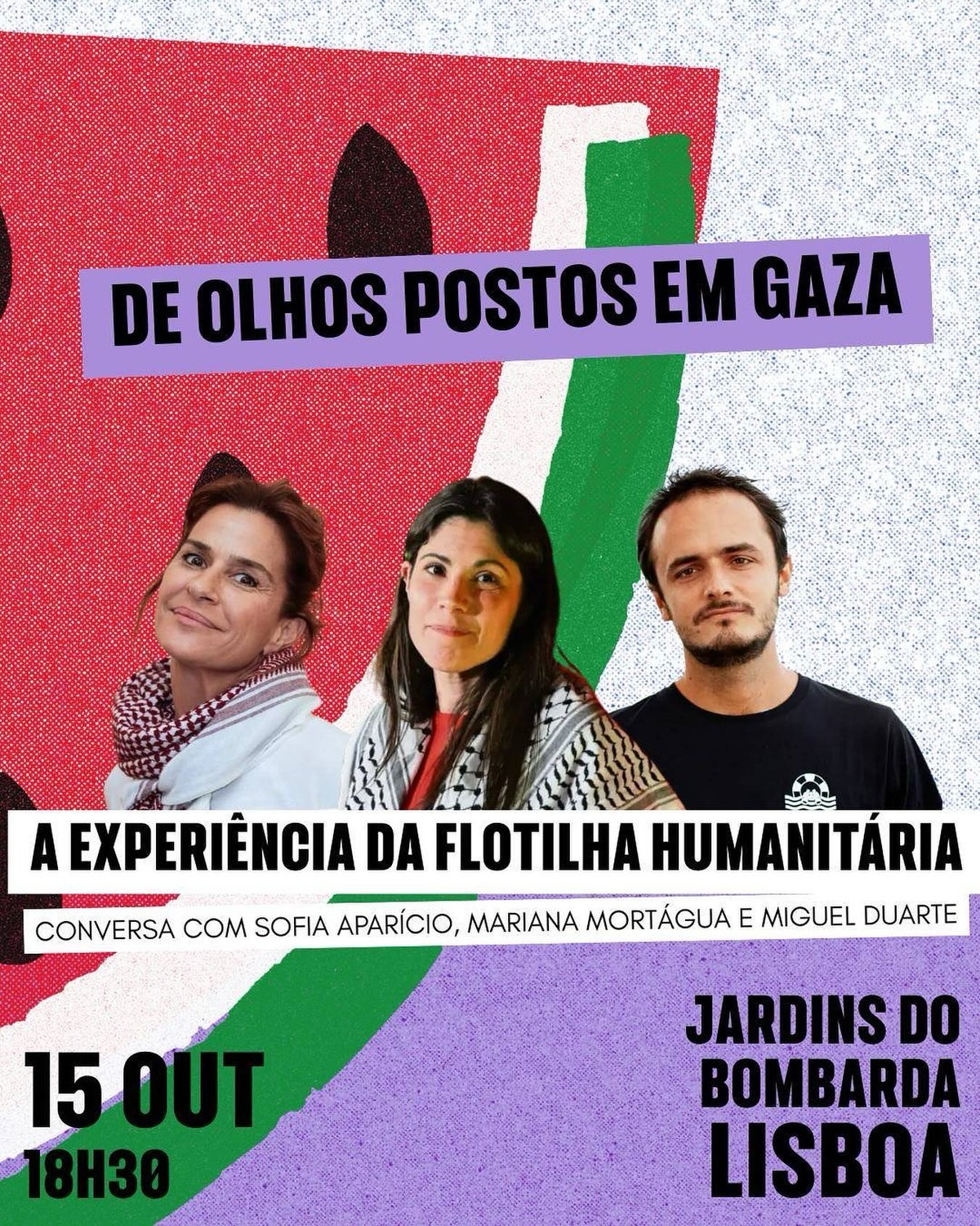 Miguel Duarte, Mariana Mortágua e Sofia Aparício, participantes da Flotilha Humanitária – Global Sumud Flotilla, partilham a sua experiência ao tentar romper o cerco ilegal a Gaza, enfrentar o ataque ilegal de Israel em águas internacionais e a detenção pelas autoridades israelitas.