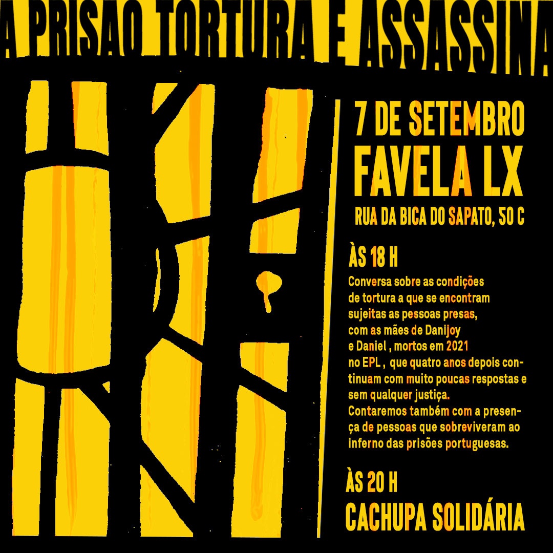 No dia 7 SETEMBRO às 18H na FavelaLx (Rua da Bica do Sapato, 50 C), juntamo-nos para uma Conversa, Convívio e Cachupa Solidária, com testemunhos de pessoas presas, familiares e companheiras sobre as condições de tortura a que se encontram sujeitas as pessoas presas, com as mães de Danijoy e Daniel, mortos em 2021 no EPL, que quatro anos depois continuam com muito poucas respostas e sem qualquer justiça. Escutaremos também a experiência de uma lutadora e sobrevivente do inferno da prisão de Tires. A partir das 20 h teremos uma maravilhosa cachupa para jantar, revertendo o dinheiro para apoio legal.
