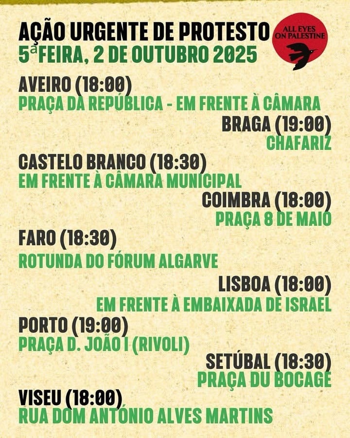 👉 Em Lisboa, o protesto será em frente à Embaixada de Israel, às 18h00.