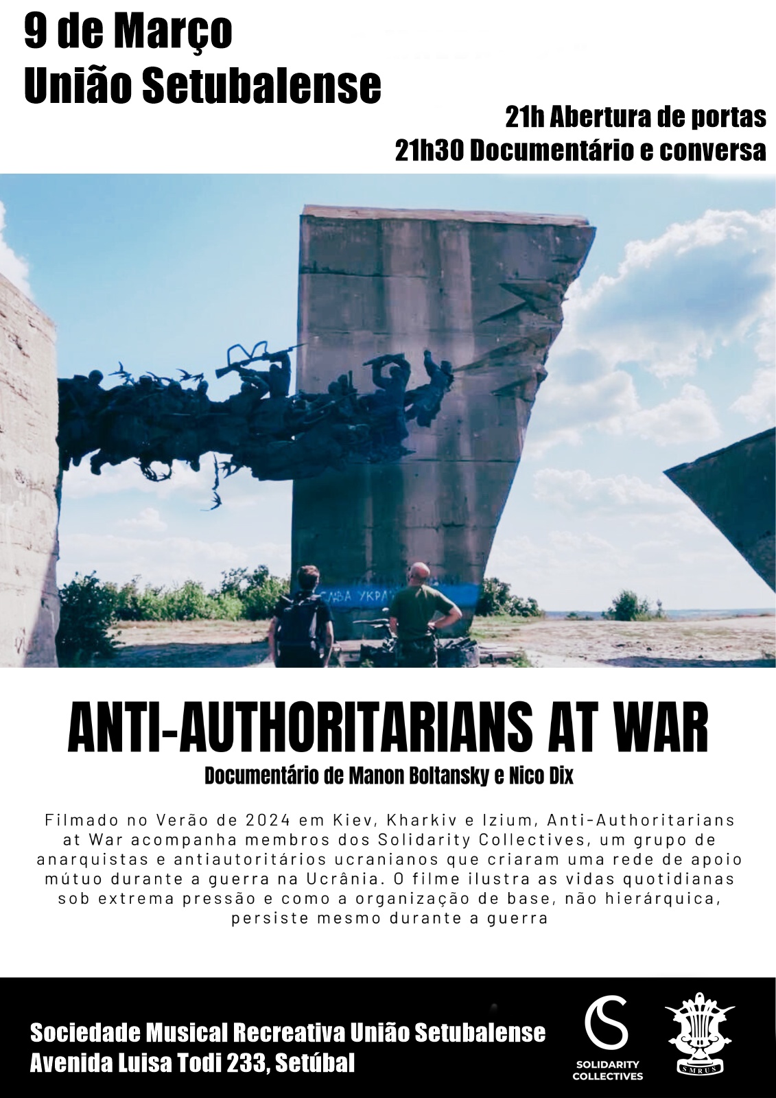 Filmado no Verão de 2024 em Kiev, Kharkiv e lzium, Anti-Authoritarians at War acompanha membros dos Solidarity Collectives, um grupo de anarquistas e antiautoritários ucranianos que criaram uma rede de apoio mútuo durante a guerra na Ucrânia. 0 filme ilustra as vidas quotidianas sob extrema pressão e como a organização de base, não hierárquica, persiste mesmo durante a guerra.