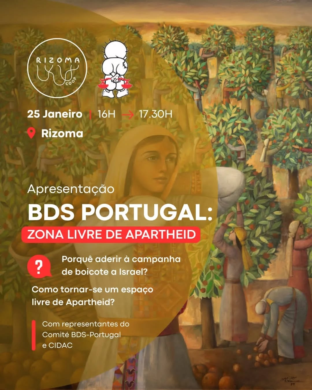 At a time when we are discussing a proposal to make Rizoma an Apartheid Free Zone, representatives from the BDS Portugal Committee and CIDAC will be on hand to answer any questions you may have. Join this conversation on January 25th at Cave Cultural