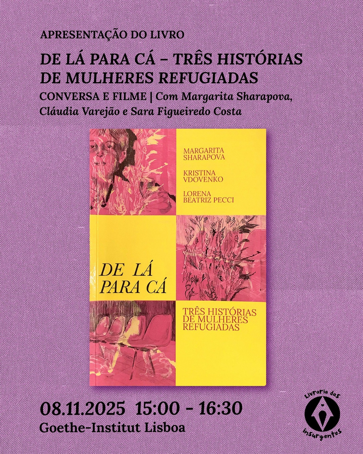 📅 No dia 8 de novembro, pelas 🕒 15h00, na 📚 biblioteca do Goethe-Institut em Lisboa, terá lugar a apresentação do livro De Lá Para Cá – Três histórias de mulheres refugiadas, das autoras ✍️ Margarita Sharapova, Lorena Beatriz Pecci e Kristina Vdovenko.