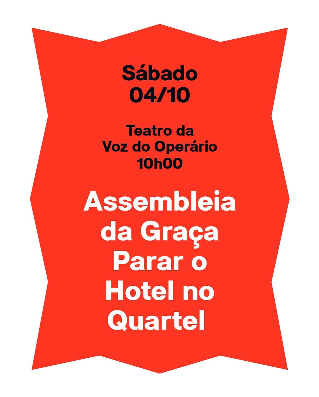 São todas/os convidadas/os para a próxima Assembleia da Graça Parar o Hotel no Quartel. Dia 4 de outubro, às 10h no Teatro da Voz do Operário. Tv. São Vicente 11, Lisboa. Unidas/os ✊🏼