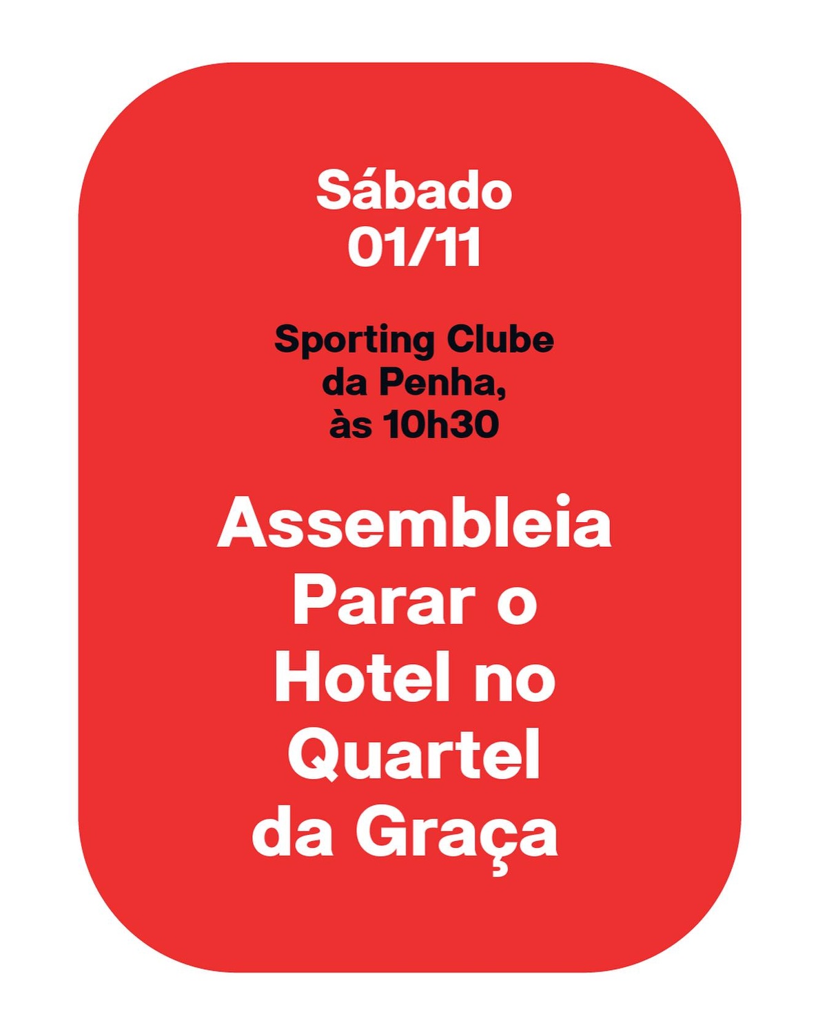Após um ano de luta, que avaliação pode ser feita? São todas/os convidadas/os para a próxima Assembleia Parar o Hotel no Quartel da Graça, sábado dia 1 de novembro às 10:30, no Sporting Clube da Penha. Rua da Penha de França 77.