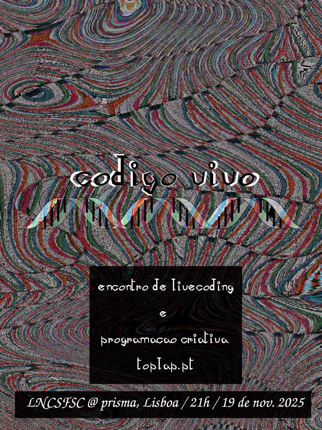 Código-vivo is code made alive, live. toplap.pt hosts its first lisbon gathering at Prisma, where everyone is invited to bring their setups and show what they are exploring in the universe of live and creative coding.
