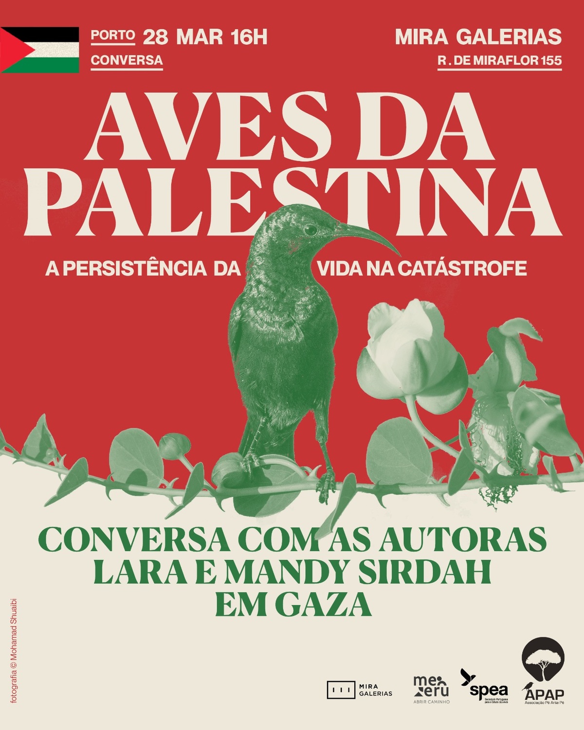 Impedidas de viajar devido ao cerco israelita, as irmãs gémeas Lara e Mandy Sirdah - autoras das fotografias tiradas na Faixa de Gaza na exposição "Aves da Palestina" no MIRA Galerias - juntam-se a nós em formato online para uma conversa sobre o seu trabalho, a biodiversidade e a importância dos ecossistemas de Gaza, a devastação ambiental e o ecocídio no contexto da campanha genocida em curso, mas também sobre as possibilidades de regeneração, liberdade e justiça.
