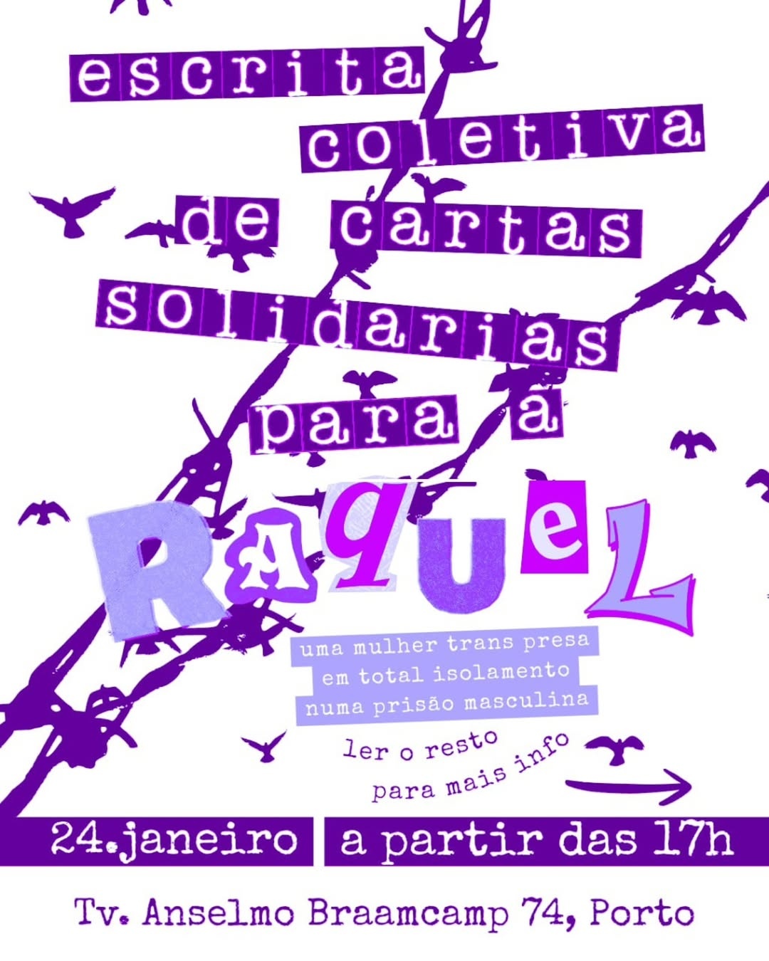 Por estas razões, queremos convidar-vos a escrever cartas de solidariedade à nossa companheira Raquel para dizer-lhe que não está sozinha. Que os direitos que lhe são negados e a violência exercida sobre o seu corpo, é exercida sobre todes nós. Embora sentida por ela na forma mais agressiva.