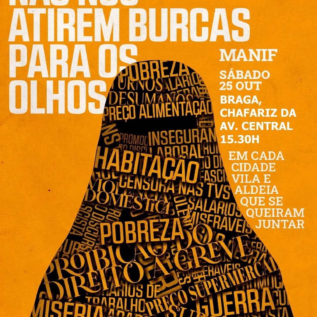 Este sábado, às 15h30, junto ao chafariz da Avenida Central, em Braga, contamos com a presença de todas as pessoas para uma concentração de protesto contra a proibição do uso do niqab e da burca, sob o falso pretexto de segurança e proteção da mulher.