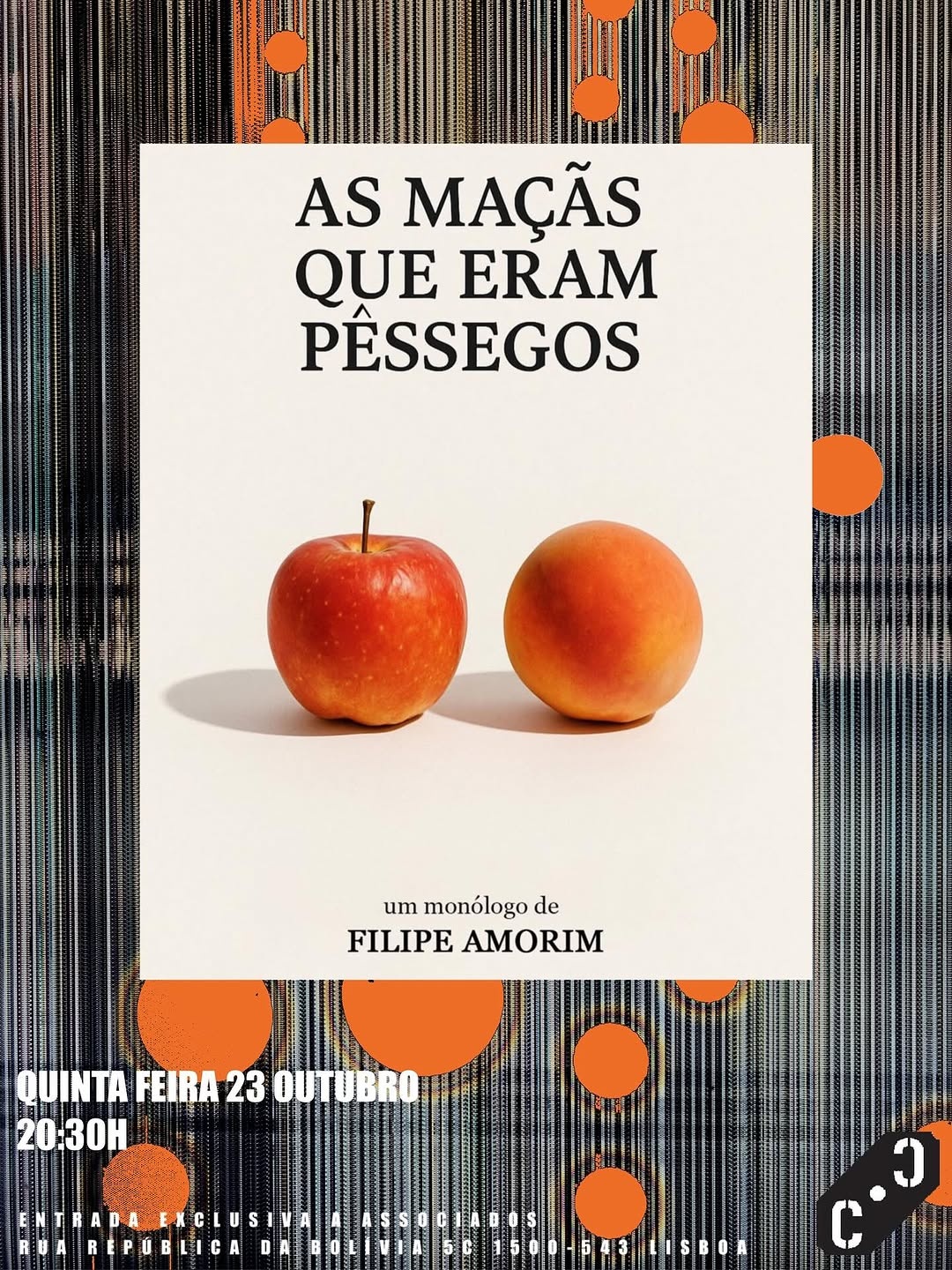 As Maçãs que eram Pêssegos é um monólogo íntimo, cómico e absurdo, onde a vida se apresenta no seu estado mais cru e surpreendente. Uma peça sobre o insólito da vida quotidiana, a coragem de rir, e a sensação de que o Universo se diverte às nossas custas.