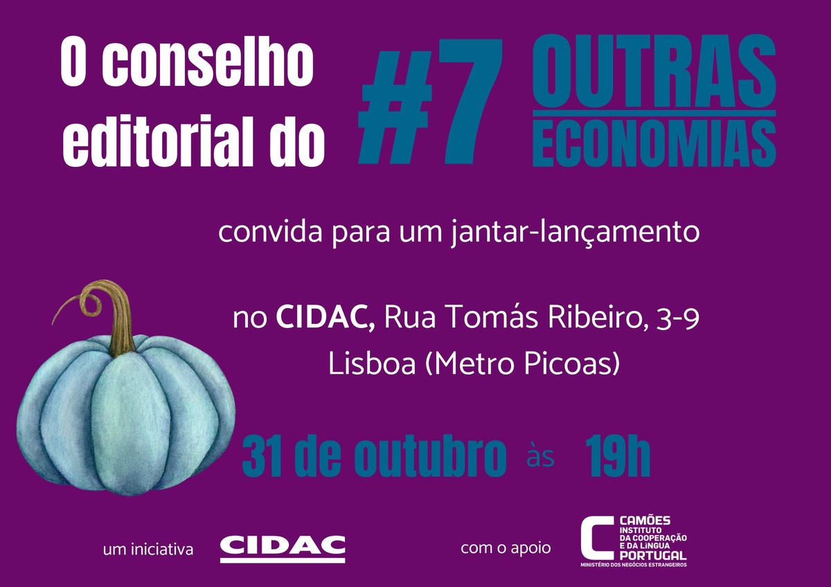 O CIDAC, Leonor Coimbra e Pedro Horta, do conselho editorial do n.º 7 da Revista Outras Economias, convidam para o jantar-lançamento desta edição, intitulada Agri-Culturas: os campos em disputa? A comida dará o mote para conversarmos em torno de algumas das principais questões tocadas no número como as sementes, o campesinato, os oligopólios agroindustriais, entre outros.