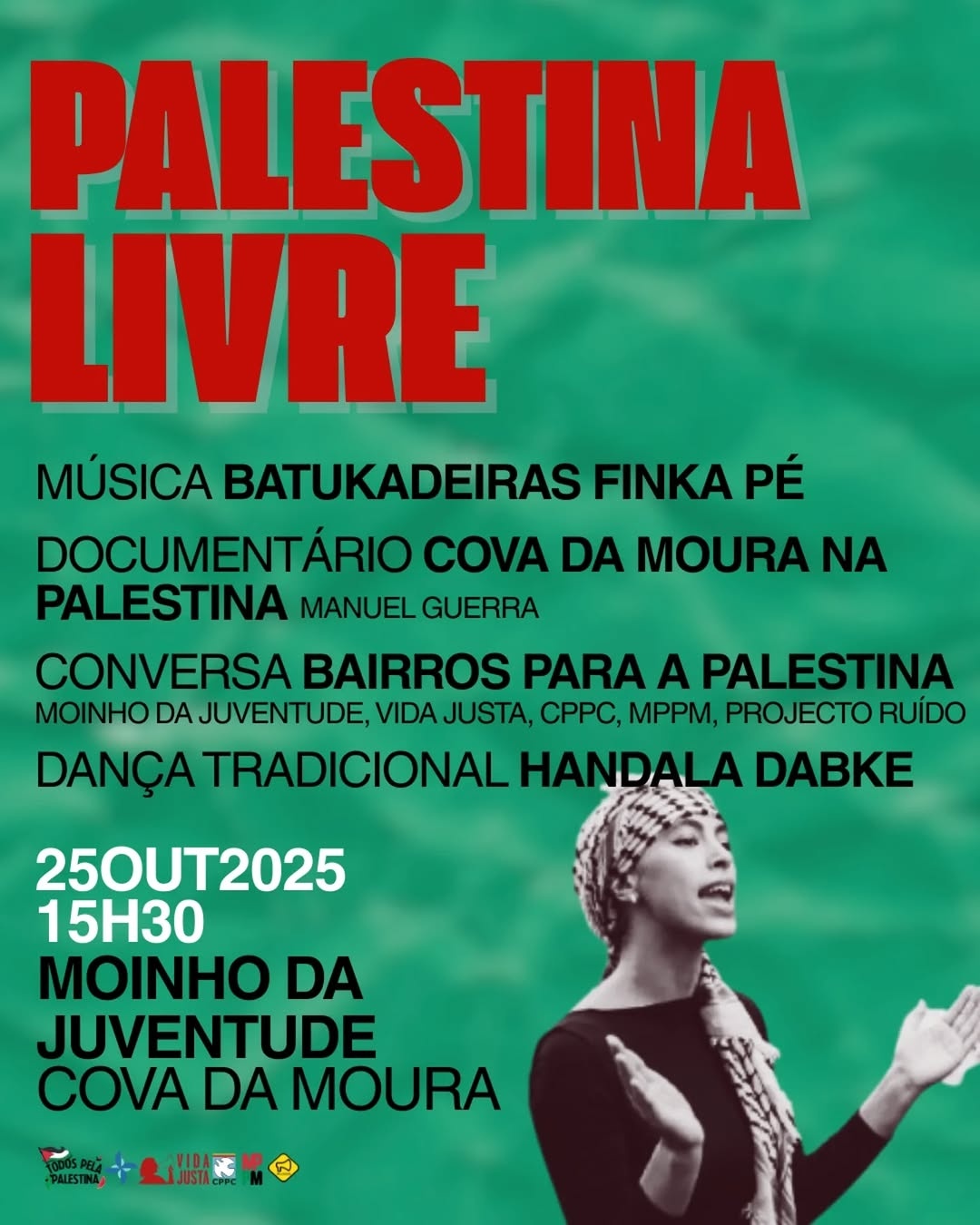✊A partir das 15h30, atuação das batukadeiras Finka Pé, exibição do documentário «Cova da Moura na Palestina», Conversa com organizações «Bairros para a Palestina» e dança tradicional com Handala Dabke!