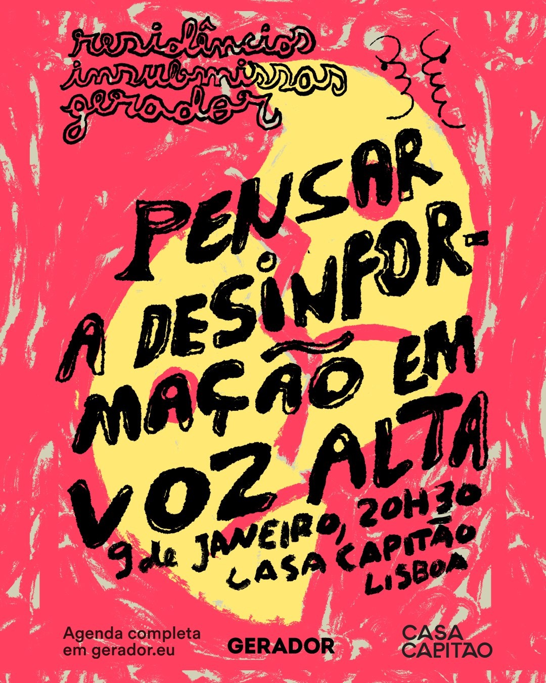 É este o ponto de partida da segunda edição das Residências Insubmissas Gerador, o nosso espaço regular de programação na Casa Capitão. Dia 9 de janeiro de 2026, a partir das 20:30, juntamo-nos para pensar a desinformação em voz alta.