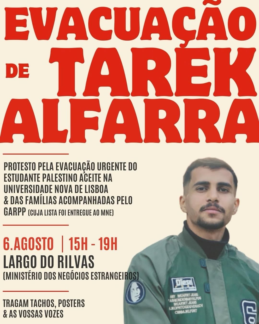 🗣️ Pela vida de Tarek. Pela sua família. Pelas 200 pessoas na lista. Pela Palestina. Pela dignidade.
