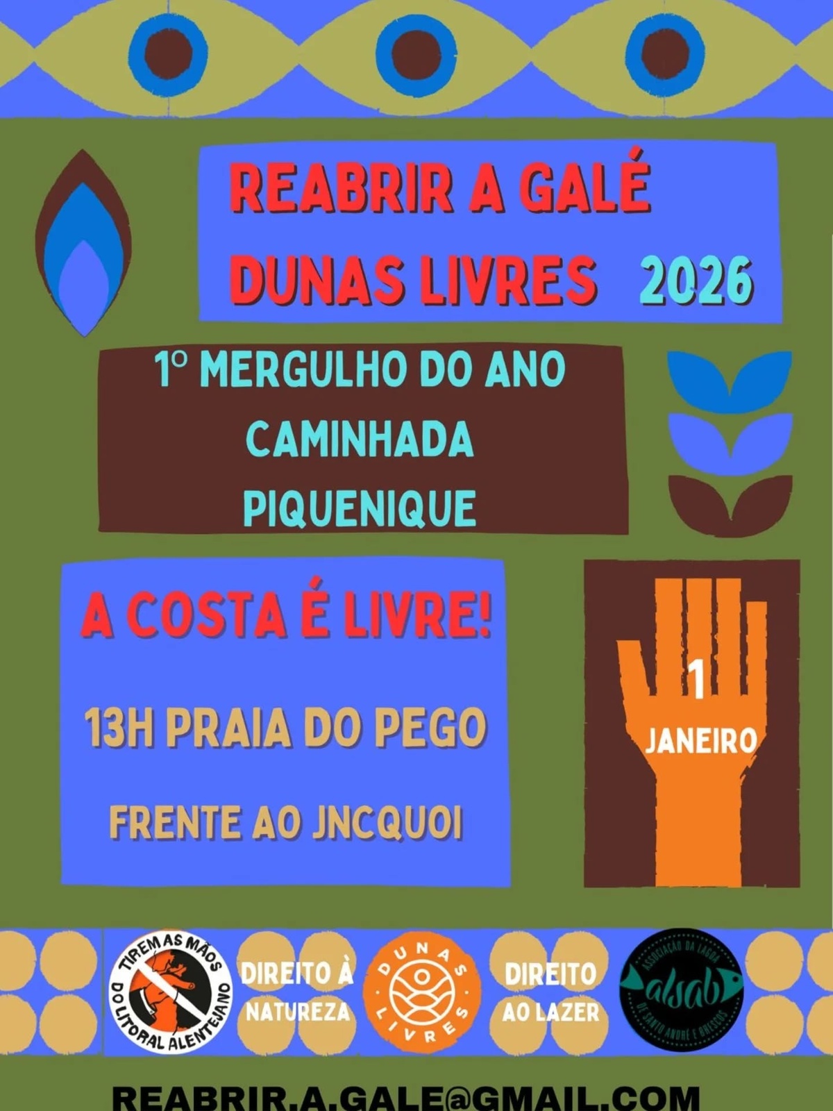 Juntamo-nos às 13h na Praia do Pego e aventuramo-nos, assim o permitindo as condições, ao mergulho. Depois há um convívio-piquenique (traz os restos da passagem de ano!) e, com amizade, resolução e vagar, seguimos numa Caminhada Lenta facilitada por Rita Bataglia @rbataglia , “Ecoar Cordão Dunar.”
