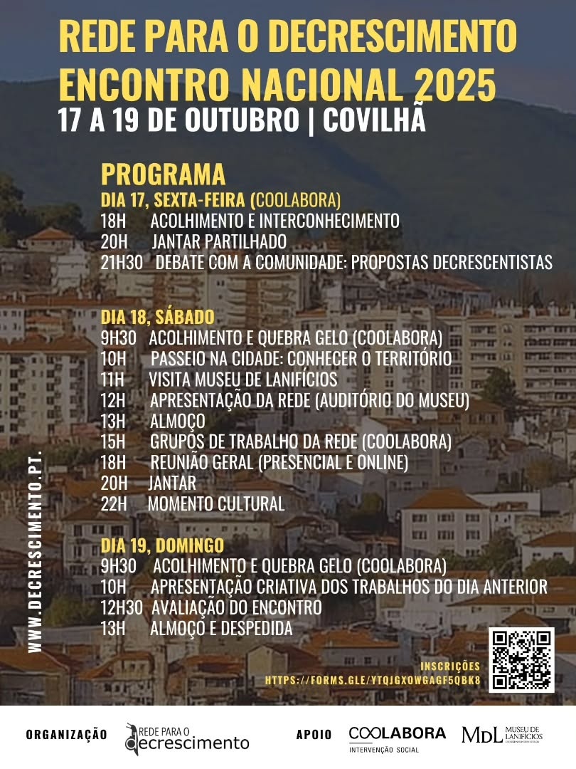 O Encontro Anual da Rede para o Decrescimento vai decorrer nos dias 17 a 19 de Outubro utubro, na Covilhã e será acolhido pela CooLabora.