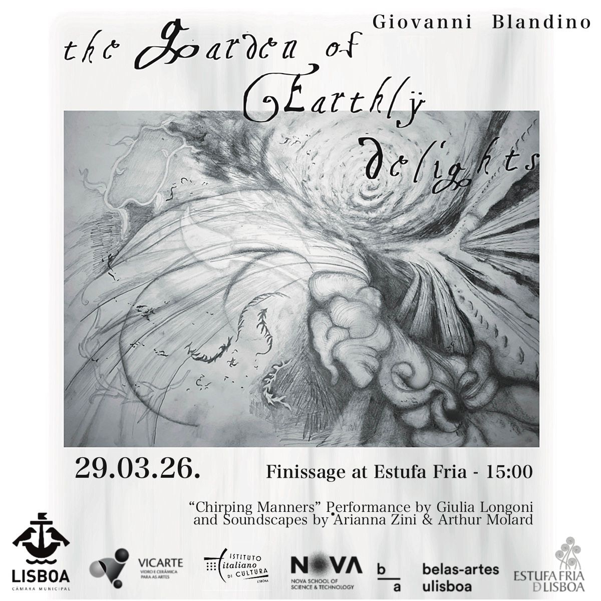 No dia 29 de março, às 15h00, o finissage vai culminar com a performance "Chirping manners" de Giulia Longoni, precedida de Soundscapes de Arianna Zini e Arthur Molard (Invertebrados).