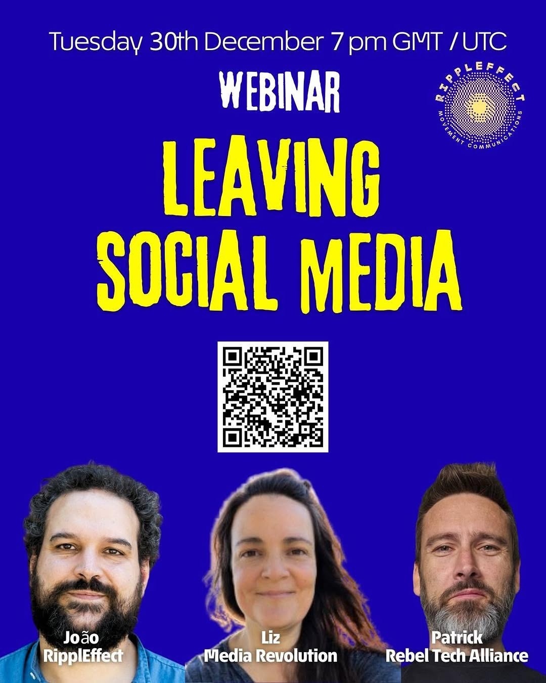 Next Tuesday we’ll talk about Leaving Social Media and alternatives to Big Tech. We aren’t doomed to stay stuck in catastrophe capitalism’s algorithms and need to find ways out of its cages and fixed narratives. There’s political and technical components for this. We’ll dive into a few of them. Join our webinar, learn about whats already happening and tell us what you’re planning. Next Tuesday at 7pm GMT / UTC. Sign up here: https://cryptpad.fr/form/#/2/form/view/P80ipnJGcaUdmZhhMQo53XBVk99uQ+doCTGGxj4xYA4/
